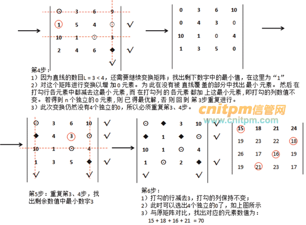 (2)试指派,找独立的零元素。独立零元素个数为m,矩阵阶数为以,当m=n时,问题得解