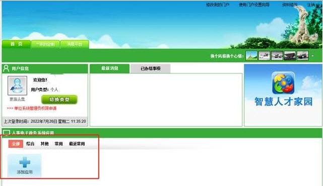 2、点击“个人用户注册”按要求填写信息注册个人账号成功后登录,然后点击“添加应用”找到“人才引进申办系统”添加