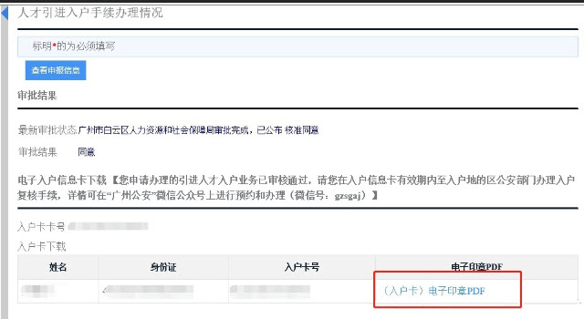 8、公示期结束,一般会收到人社局的短信通知,大家在申报系统也能看到审批状态,入户卡号。入户人员信息卡非常重要,务必下载保存好。