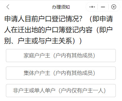 温馨提示:在“申请人目前户口登记情况”这里有三个选项,情况不同,申报方式和材料会有所不同。