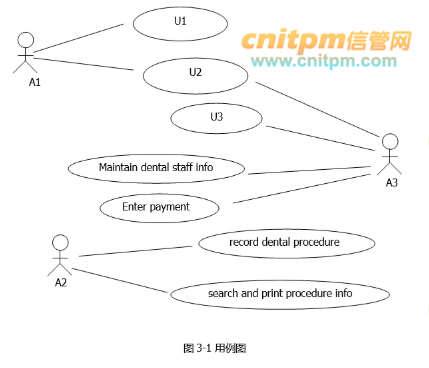 根据说明中的描述,给出图3-1中A1~A3所对应的参与者名称和U1~U3所对应的用例名称。