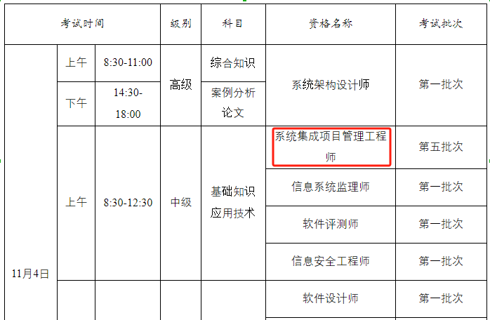 根据湖南软考办《2023年下半年计算机技术与软件专业技术资格(水平)考试湖南考区批次安排的通告》可以得知,湖南2023年下半年系统集成项目管理工程师考试时间为2023年11月4日。