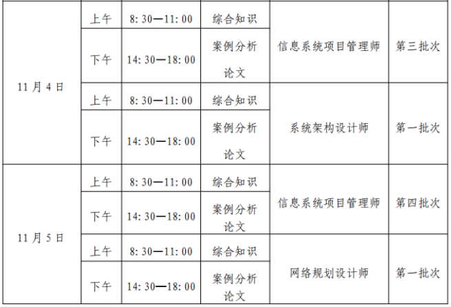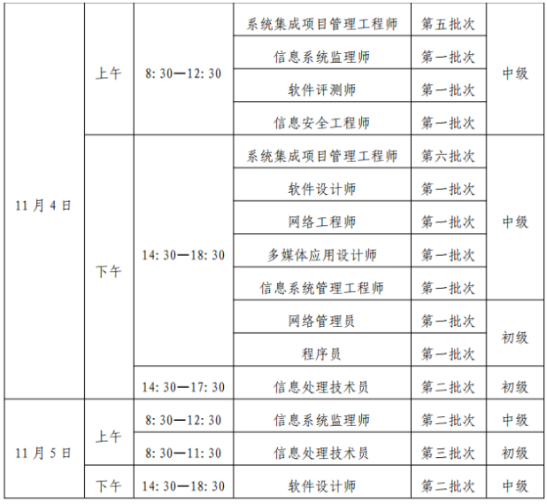 河南2023年下半年计算机技术与软件专业技术资格(水平)考试时间11月4日、5日,考试专业时间安排按照“中国计算机技术职业资格网2023下半年考试批次安排通知”执行,请河南考生于考前一周打印准考证,按照准考证上的时间、地点参加考试。