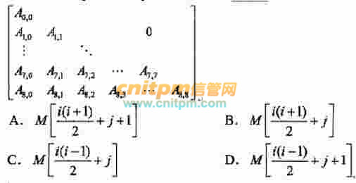 设下三角矩阵(上三角部分的元素值都为0)A[0..n,0..n]如下所示,将该三角矩阵的所有非零元素(即行下标不小于列下标的元素)按行优先压缩存储在容量足够大的数组M[]中(下标从1开始),则元素A[i,j](0≤i≤n,j≤i)存储在数组M的()中。