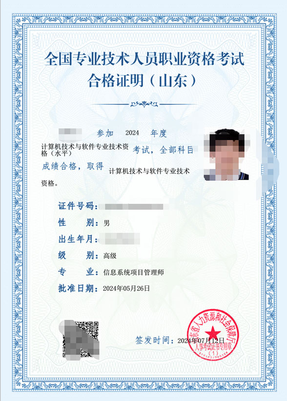 2024年7月12日,山东发布了2024年上半年软考电子证书,山东软考信息系统项目管理师电子证书样本图片如下,该电子证书在山东省内与纸质证书有同等效力。