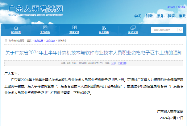 关于广东省2024年上半年计算机技术与软件专业技术人员职业资格电子证书上线的通知