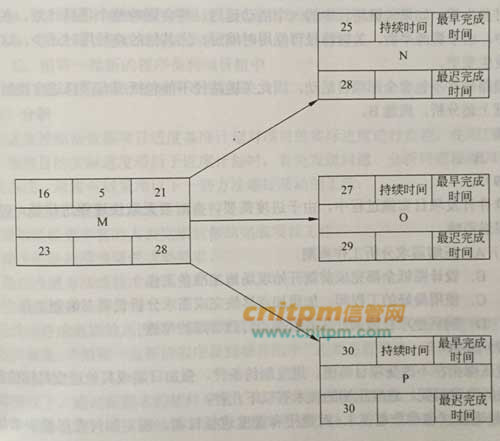 参见上图,M活动的最早开始时间(ES)=16天,最早结束时间(EF)=21天;使用逆推法计算最迟结束时间(LF)=28天,最迟开始时间(LS)=28-5=23天