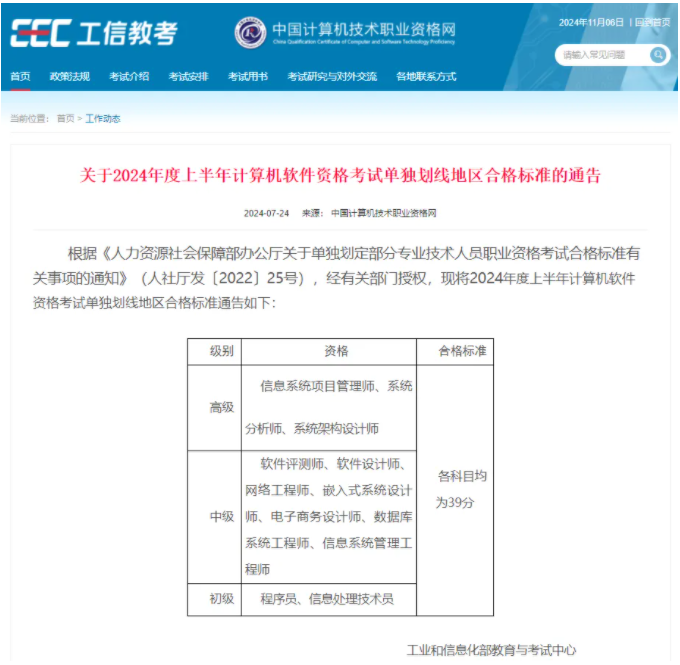 2024年上半年软考单独划线分数线为:各科39分及格。