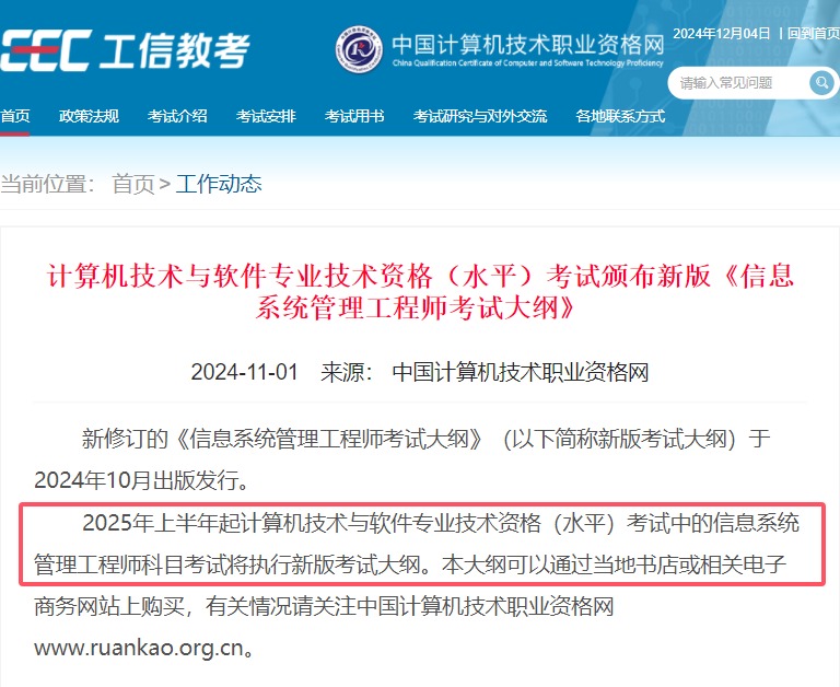 根据中国计算机技术职业资格网发布的通知,自2025年上半年起信息系统管理工程师科目考试将执行新版考试大纲。
