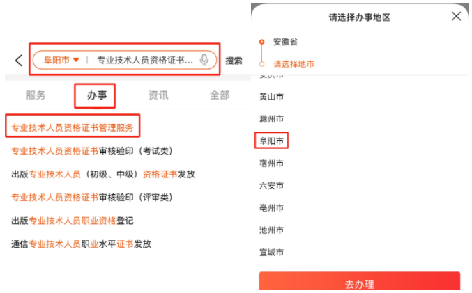 2.在跳转的页面内输入“专业技术人员资格证书管理服务”,选择“办事”模块,点击下方“专业技术人员资格证书管理服务”,选择办事地区“阜阳市”,点击“去办理”。