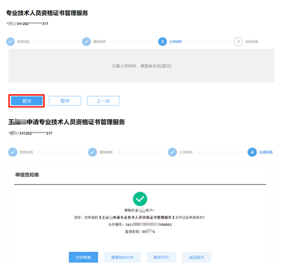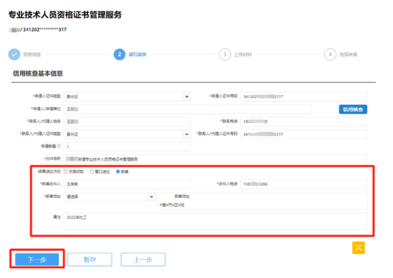 3.在“结果送达方式”中选择“邮寄”,完善邮寄收件人姓名、电话、地址等信息,在“备注”栏填写拟申领证书的考试年度和名称,如“2022年社工”点击“下一步”,最后在跳转的页面中点击“提交”即可完成。