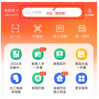 1.打开皖事通APP并完成账户登录,点击首页“搜索框”。