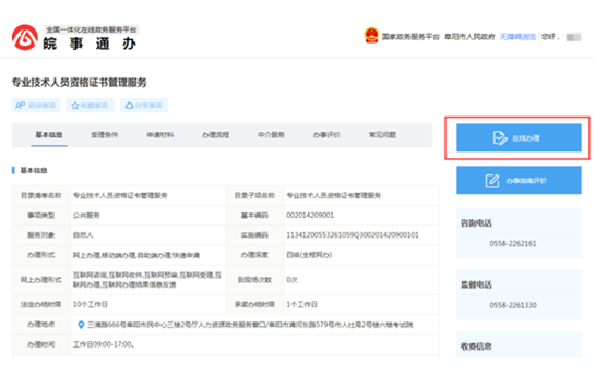 1.通过浏览器打开安徽政务服务网阜阳分厅,搜索“专业技术人员资格证书管理服务”,或直接点击链接(http://fy.ahzwfw.gov.cn/bog-bsdt/static/workProcess/components/applicationMaterial.html?ssqdCode=2e1ef02546b543e6ab5b8f718e1b5a12),即可进入我市“专业技术人员资格证书管理服务”事项办理界面,点击右侧“在线办理”。
