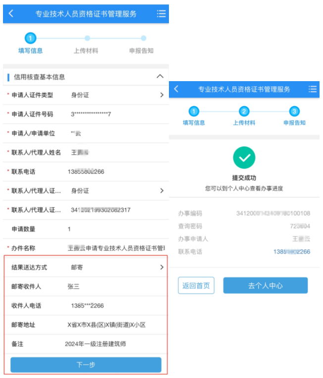 3.在“结果送达方式”中选择“邮寄”,完善邮寄收件人姓名、电话、地址等信息,在“备注”栏填写拟申领证书的考试年度和名称,如“2024年一级建筑师”,点击“下一步”,最后在跳转的页面中点击“提交申请”即可完成。