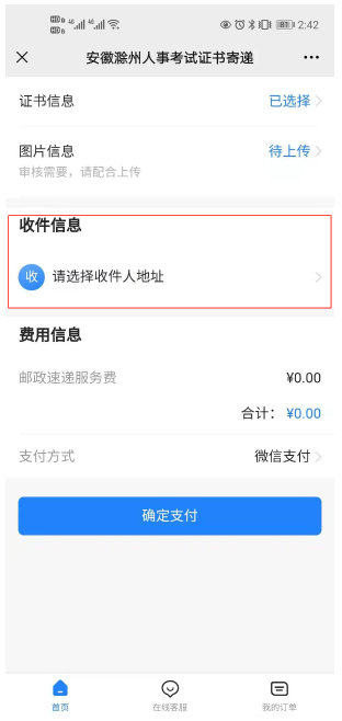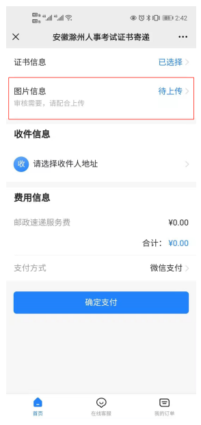 2、邮寄服务办理流程:扫描中国邮政邮寄业务二维码—填写考生信息—核对考生证书信息—上传考生本人手持身份证照片—填写收件地址—系统自动计费—线上支付—邮寄送达。