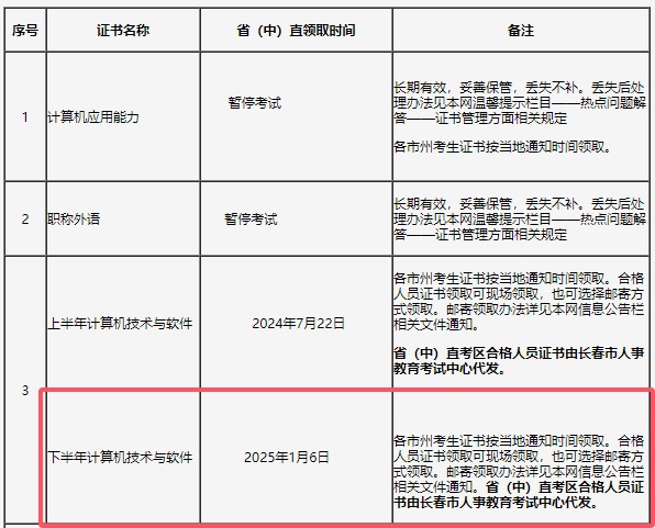 根据吉林人事考试网 < 2024年全国各类专业技术资格考试各类证书领取通知 > 专栏了解得知,吉林2024年下半年软考证书于2025年1月6日开始发放,合格考生可通过快递邮寄和现场办理两种方式领取证书。
