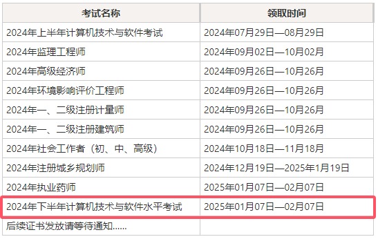 2024年度专业技术人员职业资格考试合格证书领取通知(2025年01月07日更新)
