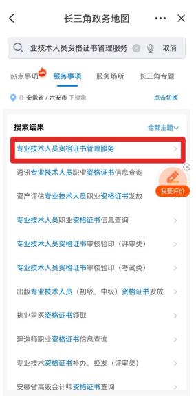 第三步:搜索服务事项 “专业技术人员资格证书管理服务”。