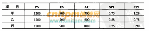 经计算,项目甲乙丙的SPI、CPI如下表所示。
