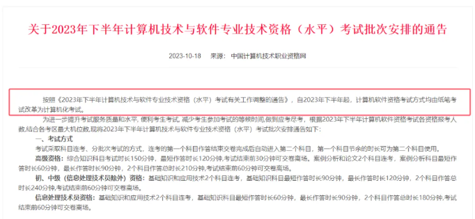 2023年下半年起,软考从传统笔试全面转向计算机机考模式,实现了“无纸化”考试。各考试科目由分散更替为连考。不仅提升了考试效率,如自动阅卷、即时成绩统计、雷同试卷查重,也从侧面增加了考试难度。