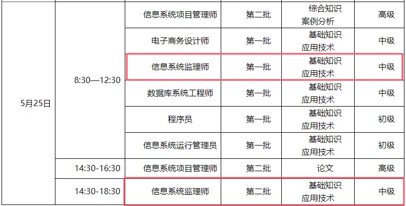 根据软考办发布的《关于2025年上半年计算机技术与软件专业技术资格(水平)考试批次安排的通告》得知,与往年不同的是,2025年上半年信息系统监理师因报考人数较多,特分两批次开考,分别在5月25日的上午和下午。
