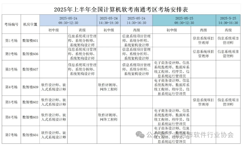 根据南通市软件行业协会发布的《2025年上半年全国计算机软考南通考区考生须知》得知,江苏南通2025年上半年软件设计师考点设置在南通理工学院,考生于考前40分钟应抵达准考证上所指定的考点,具体考场位置安排请以准考证上所示为准。