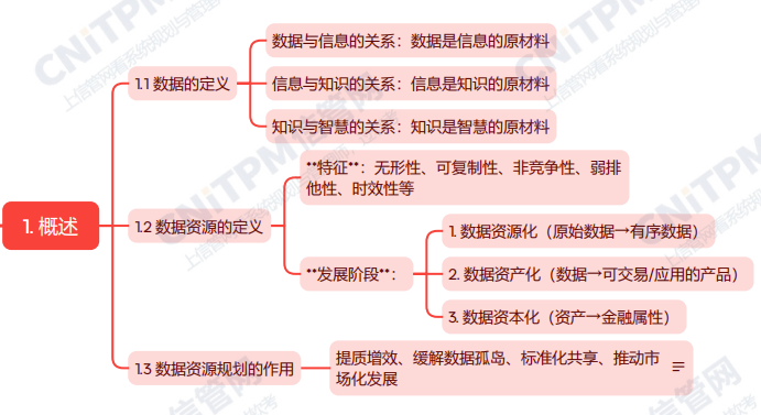 系统规划与管理师第3版教程第八章数据资源规划第一节主要内容考点涉及:数据定义、数据资源的特征和发展阶段、数据资源规划的作用等,具体思维导图整理如下: