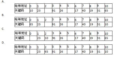 设散列函数为H(key)=key%ll,对于关键碍序列(23,40,91,17,19,10,31,65,26),用线件探杳法解决冲突构造的哈希表为( )。