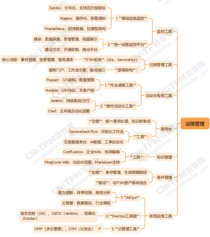 系统规划与管理师第3版教程第十六章资源与工具管理第二节主要内容考点涉及:监控工具、过程管理工具、自动化专用工具、服务台、知识管理、备件管理、新型运维工具等,具体思维导图整理如下: