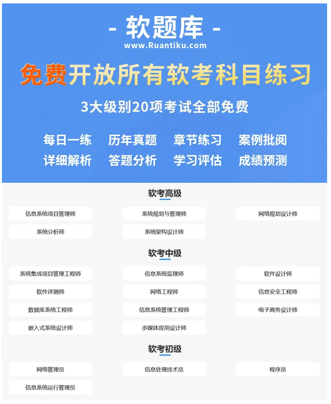 涵盖所有软考开考资格科目,并提供答案解析。让你不再四处盲目找题,一站全搞定!!