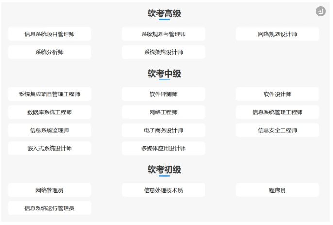 中级资格:系统集成项目管理工程师、软件评测师、软件设计师、数据库系统工程师、网络工程师、信息系统管理工程师、信息系统监理师、电子商务设计师、信息安全工程师、嵌入式系统设计师、多媒体应用设计师