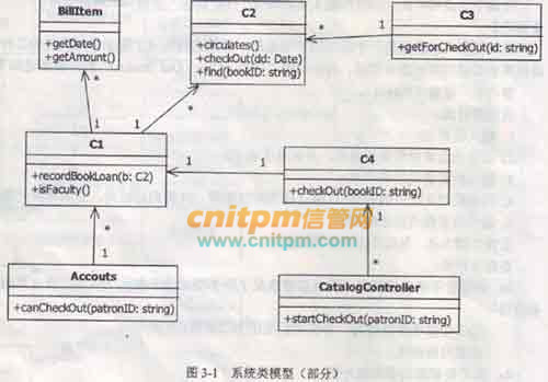 现采用面向对象方法开发该系统,得到如图3-1所示的系统类模型(部分);以及如图3-2所示的系统操作”checkOut(bookID)”(借书) “通信图(或协作图)”。