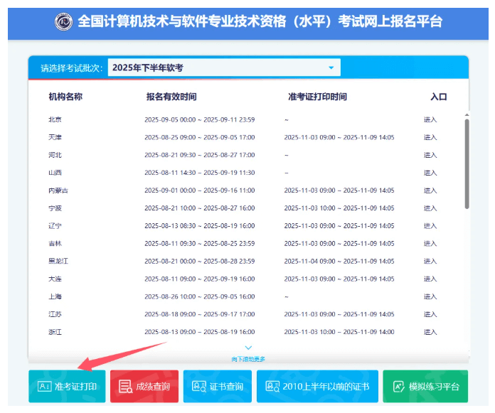 根据各地软考办的相关安排,2025年下半年软考准考证打印入口于今日(11月3日)集中陆续开放,陕西考区11月1日已开放打印入口,请考生尽快登录中国计算机技术职业资格网进行打印。