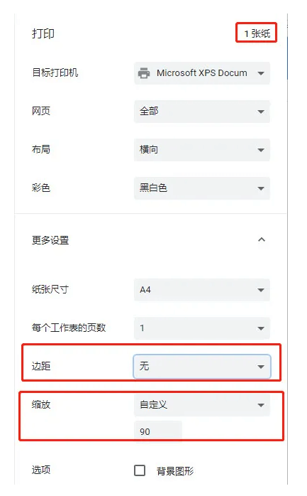 以谷歌Chrome浏览器为例,在打印预览界面可进行以下调整: