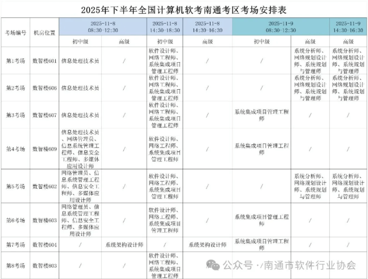 南通软件行业协会发布了《2025年下半年全国计算机软考南通考区考生须知》的通知,针对南通2025年下半年软考考试地点、考生注意事项、考场规则等相关事宜进行了说明,具体如下: