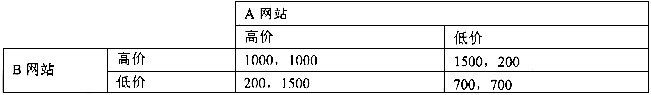 站在A网站的立场上看,假设B网站采用高价策略,那么自己采用高价策略得1000万元,采用低价策略得1500万元,显然应该采用低价策略;如果B网站采用低价策略,那么自己采用高价策略得200万元,采用低价策略得700万元,显然也应该采用低价策略。同样,站在B网站的立场上看,也是这样,不管A网站采用什么价格策略,自己都应采用低价策略为好。由于A、B网站的主管都独立理性地分析了这种情况,因此,这个博弈的最终结果一定是两个网站都采用低价策略,各得到700万元的利润。这是一个非合作博弈之例。参与博弈的任一方都无法信任对方,都要防备对方抢占自己的市场份额,但也都能独立理性地分析自己的策略与得益;所以,双方博弈的结果对双方都不是理想的结果,但都认为是可以接受的。而合作双赢(都采用高价策略),却涉嫌市场垄断。