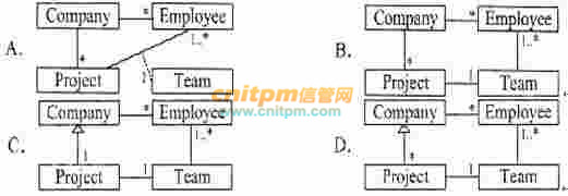 对于场景:一个公司(Company)负责多个项目,每个项目(Project)由一个员工(Employee)团队(Team)来开发。下列UML概念图中,( )最适合描述这一场景。