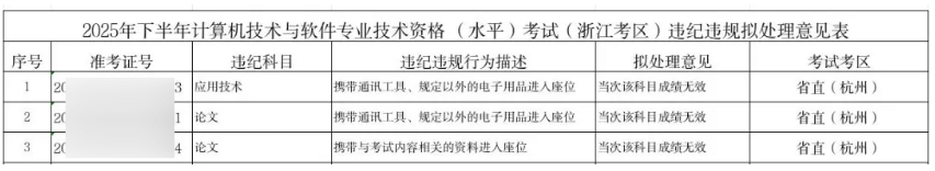 2025年下半年计算机技术与软件专业技术资格(水平)考试(浙江考区)违纪违规拟处理公告
