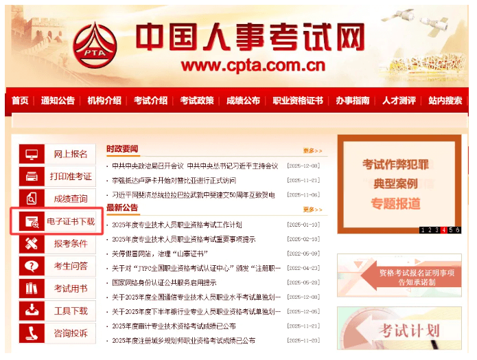 第一、进入中国人事考试网 http://www.cpta.com.cn/ ,找到左侧的 "电子证书下载" 栏目,直接点击即可。