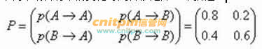 假设市场上某种商品有两种品牌A和B,当前的市场占有率各为50%。根据历史经验估计,这种商品当月与下月市场占有率的变化可用转移矩阵P来描述: