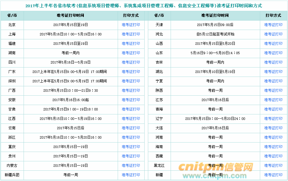 答:2017年上半年软考准考证打印时间一般为考前一个星期左右,也就是5月15号左右开始打印准考证。具体请查看各省市准考证打印专题>>