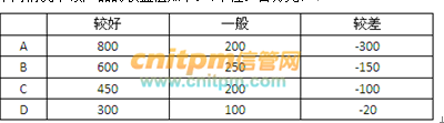 某企业要投产一种新产品,生产方案有四个:A新建全自动生产线;B新建半自动生产线;C购置旧生产设备;D外包加工生产。未来该产品的销售前景估计为较好、一般和较差三种,不同情况下该产品的收益值如下:(单位:百万元)