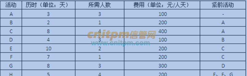 已知某信息工程由A、B、C、D、E、F、G、H八个活动构成,项目的活动历时,活动所需人数、费用及活动逻辑关系如下表所示
