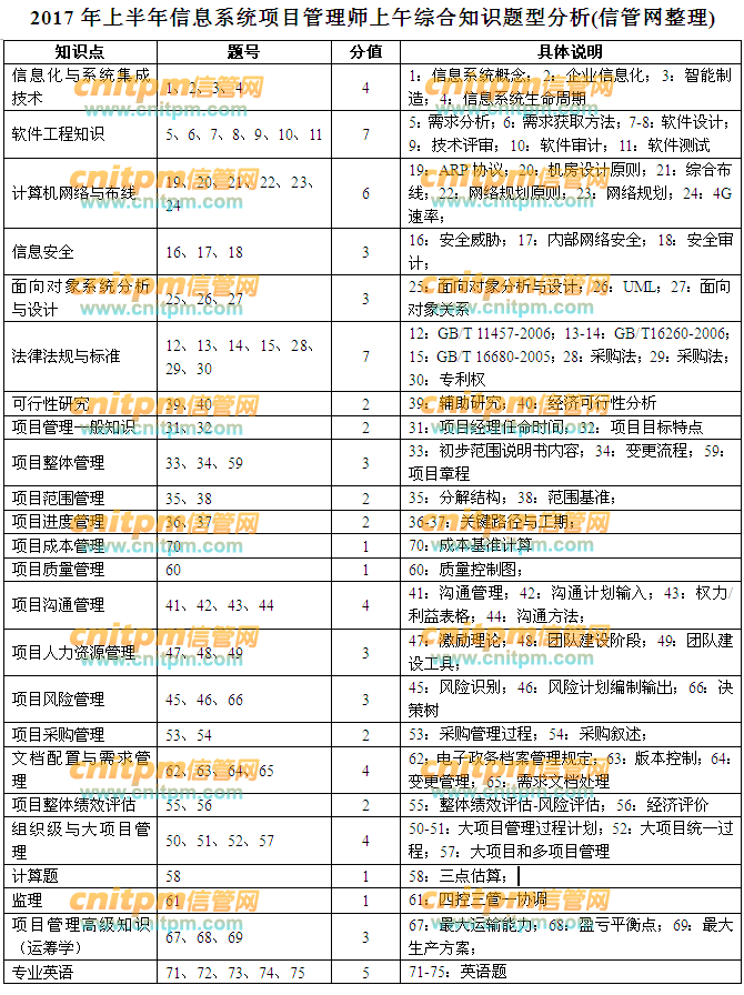 信息系统项目管理师考试知识点分布广,范围宽,涉及到项目管理知识、计算机基础知识、系统集成基础知识、法律法规知识、管理学知识、专业英语知识等内容。就2017年上半年高项考试来说,从大家考试后的反映以及结合试题来看,上午综合知识不是很难,从大家估分来看50-60分的有很多;案例分析这次真的非常简单,尤其计算题还是2012年下半年中级考过的一道完全类似的题;论文也中规中矩,考的二个论题都是九大管理领域的。