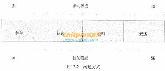 在进行沟通过程中,要根据沟通目标、参与者的特点选择适合的沟通方式。一般沟通过程所采用的方式分为以下几类:参与讨论方式、征询方式、推销方式(说明)、叙述方式,如图12-2所示。