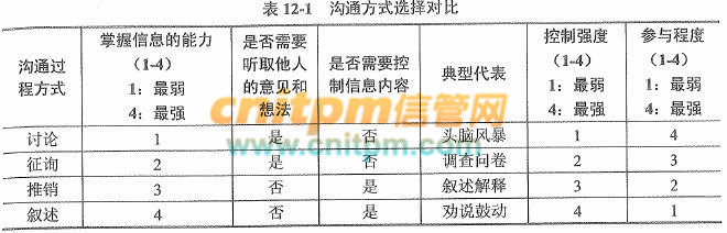 以信息的发布者角度看,沟通方式选择矩阵提供了沟通方式选择的对比,如表12-1所示。