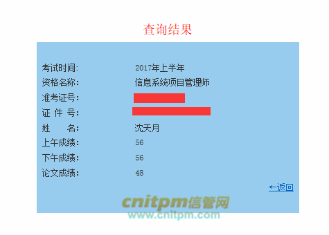 2017年7月10日,又是一个特别的日子,这一天距离软考查成绩的惯例已经过去了近一周,内心不免焦急难耐。令人啼笑皆非的是,下午我刚一打开全国软考办官网,就发现首页已经弹出了成绩查询的界面,但是却全部显示为乱码(部分浏览器不兼容,今天已经恢复正常),顿时笑得合不拢嘴。莫不是软考办被大家催得太急切了,数据导入的时候没有检查显示界面,出了差错?不管怎么样,成绩是得查的。于是我点击查询,56,56,48的成绩映入眼帘,顿时我兴奋异常。因为这一刻我已经等待了两年,两年前的那次,我因为论文被卡通过率名落孙山;两年之后的今天,我终于如愿以偿,高分通过信息系统项目管理师,在毕业之际获得了名义上的高级职称。
