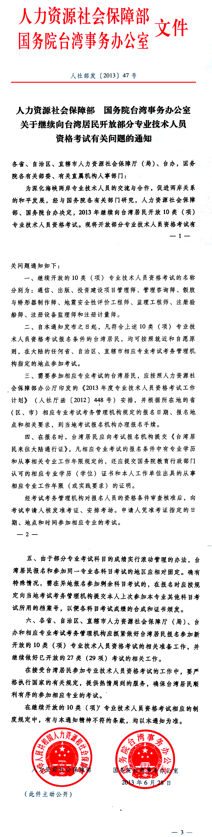 关于继续向台湾居民开放部分专业技术人员资格考试有关问题的通知