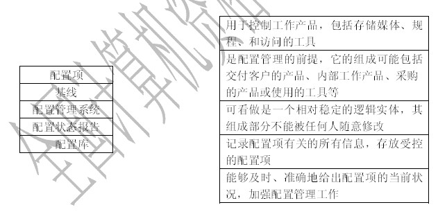 以下左侧表格中是配置管理的基本概念,右侧表格是有关这些概念的论述,请在答题纸上用直线将左侧表格与右侧表格里的对应连接起来。
