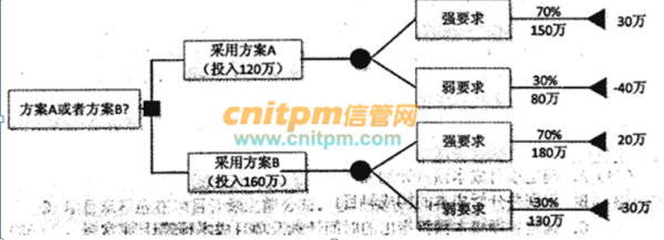某公司正在准备竞标一系统集成项目,为了估算项目的收益,技术总监带领风险管理团队,对项目可选的两种集成实施方案进行了决策树分析,分析图如下所示。以下说法中,正确的是()。